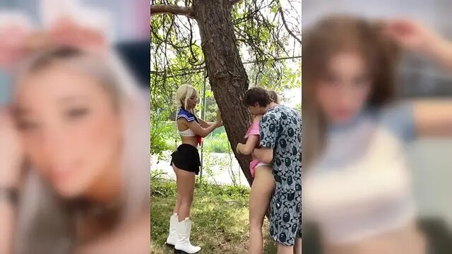 Two teens find a guy and share his big dick in public. They take turns sucking him and riding him. He cums all over their faces and their clothes.